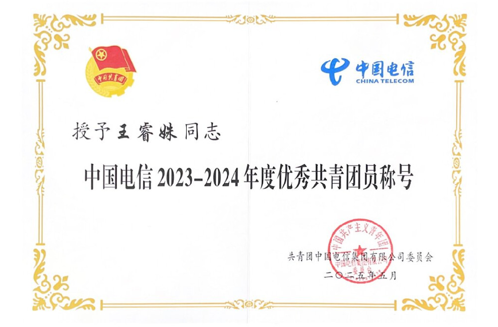 近日,中國電信揭曉2023-2024年度“五四紅旗團委”“五四紅旗團支部”“優(yōu)秀共青團員”“優(yōu)秀共青團干部”評選結(jié)果,公誠管理咨詢有限公司第一分公司王睿姝榮獲“優(yōu)秀共青團員”稱號。